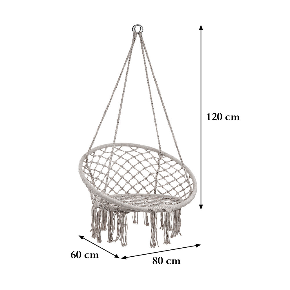 A szürke Cardenas szürke függőfotel kiválóan illeszkedik otthonod vagy teraszod méreteihez. Vasvázas pamut zsinórral rendelkezik, méretei 80x60x120 cm, ami ideális arányokat biztosít a kényelmes és kifinomult pihenéshez. Az 80 cm szélesség kényelmes helyet nyújt az üléshez és a test pozícionálásához, miközben a 60 cm mélység lehetővé teszi a test kényelmes elhelyezkedését. A 120 cm magasság pedig megfelelő távolságot biztosít a talajtól, hogy könnyedén beülhess a függőfotelbe. Emellett fontos megemlíteni, hogy a Cardenas függőfotel rendkívül tartós és stabil, hiszen terhelhetősége akár 180 kg is lehet. Tehát bátran élvezheted a kényelmet és nyugalmat, anélkül hogy aggódnod kellene a függőfotel megbízhatósága miatt.