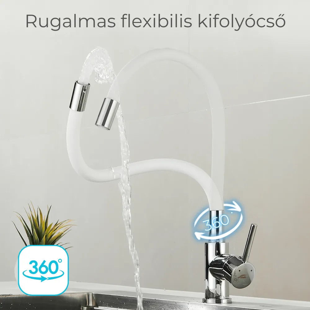 A fehér és króm színek elegáns megjelenést biztosítanak, miközben a rugalmas, 360°-ban forgatható kifolyócső maximális szabadságot nyújt a konyhai mindennapokban.