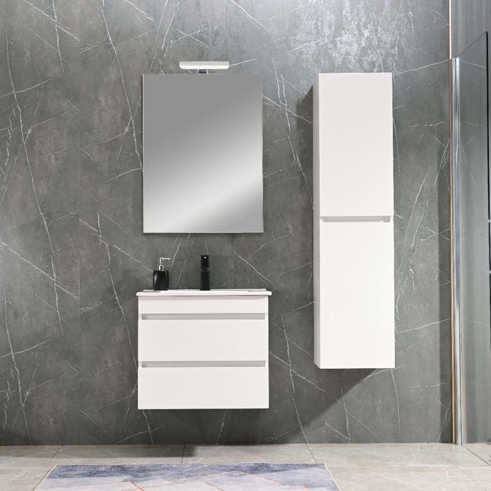 A fürdőszobabútor kevés helyet foglal viszont rendelkezik két tágas fiókkal ahol kényelmesen elférnek a fürdőszobai pipere eszközök. Kevés helyigénye miatt kisebb fürdőszobák berendezésére is alkalmas, például panel lakásokban.