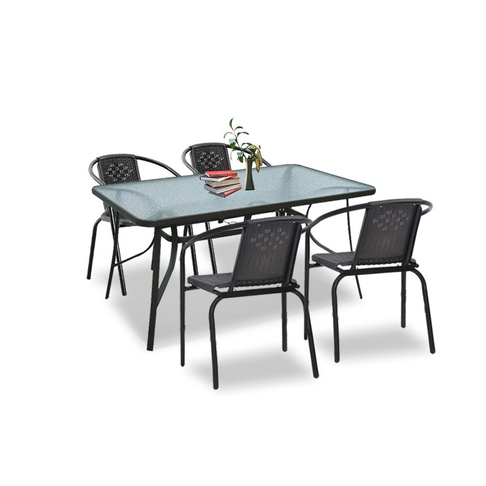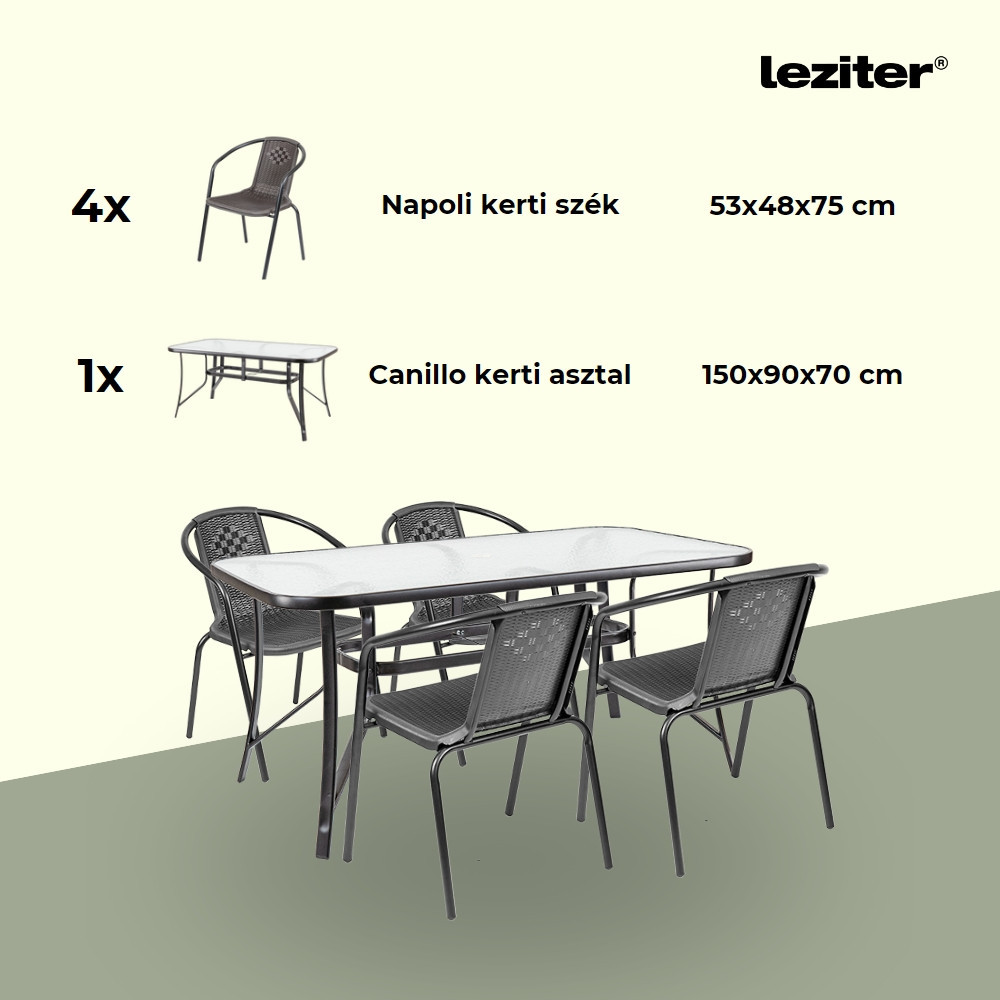 A modern kivitelű kerti bútorkészlet egy kerti üveglapos asztalt és 4 széket tartalmaz. A bútorokat 4 fő számára tervezték. A székek és az asztal lábazata fémből készül. Az asztallap 5 mm-es edzett üvegből készült, amely ellenáll a kisebb karcolásoknak. A műanyag szék ülésanyaga ellenáll az időjárási viszonyoknak. Előnye az ergonómikusan profilált ülés és karfa, amelyek tehermentesítik a vállakat pihenés közben.