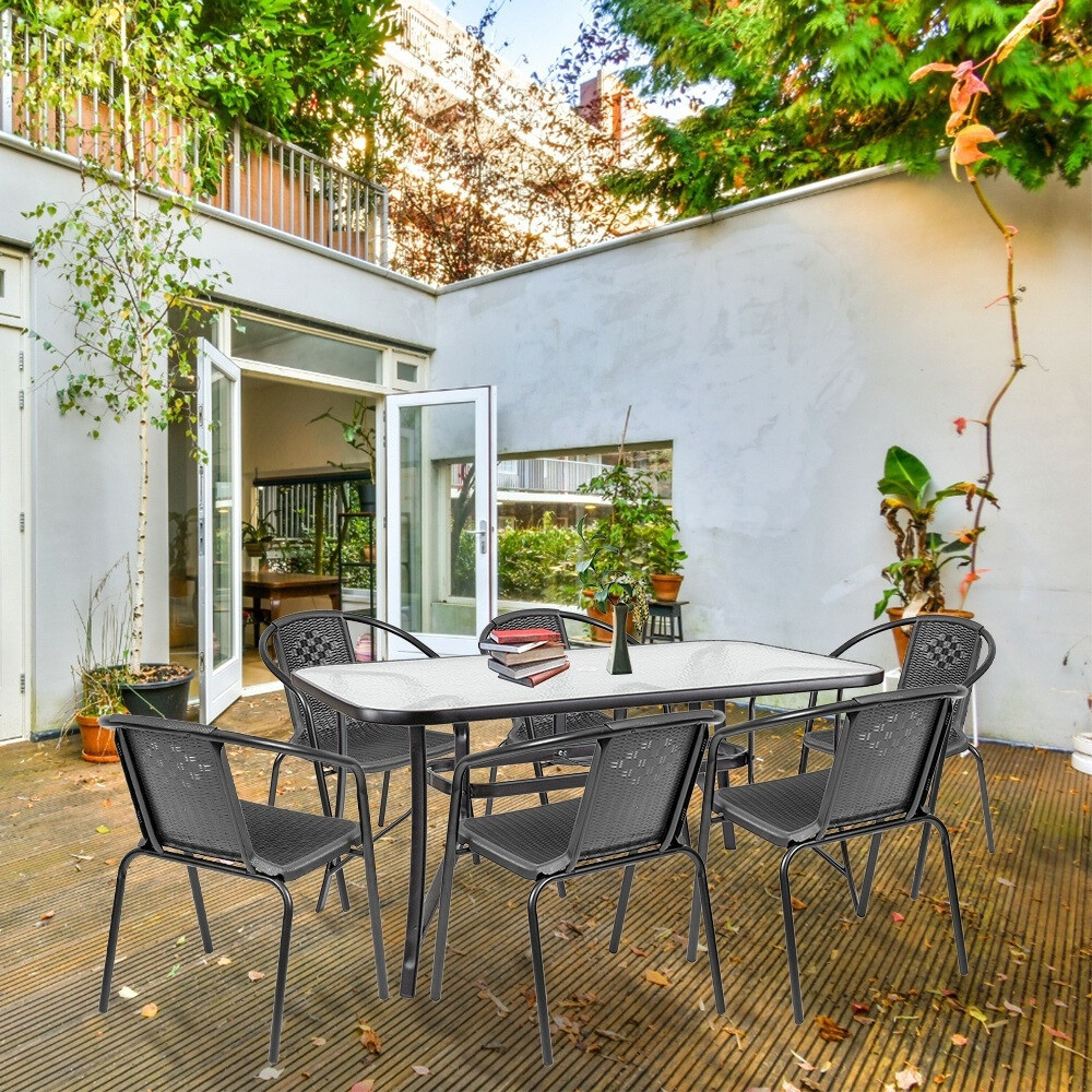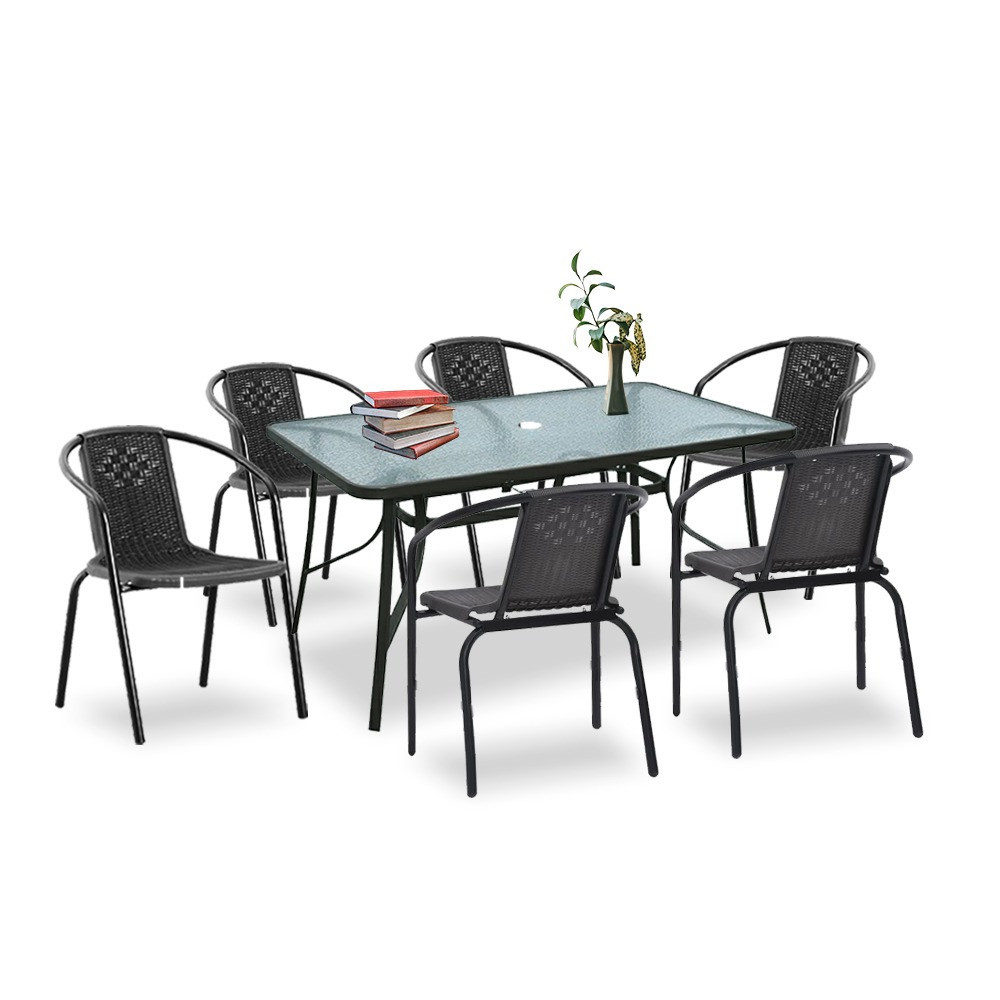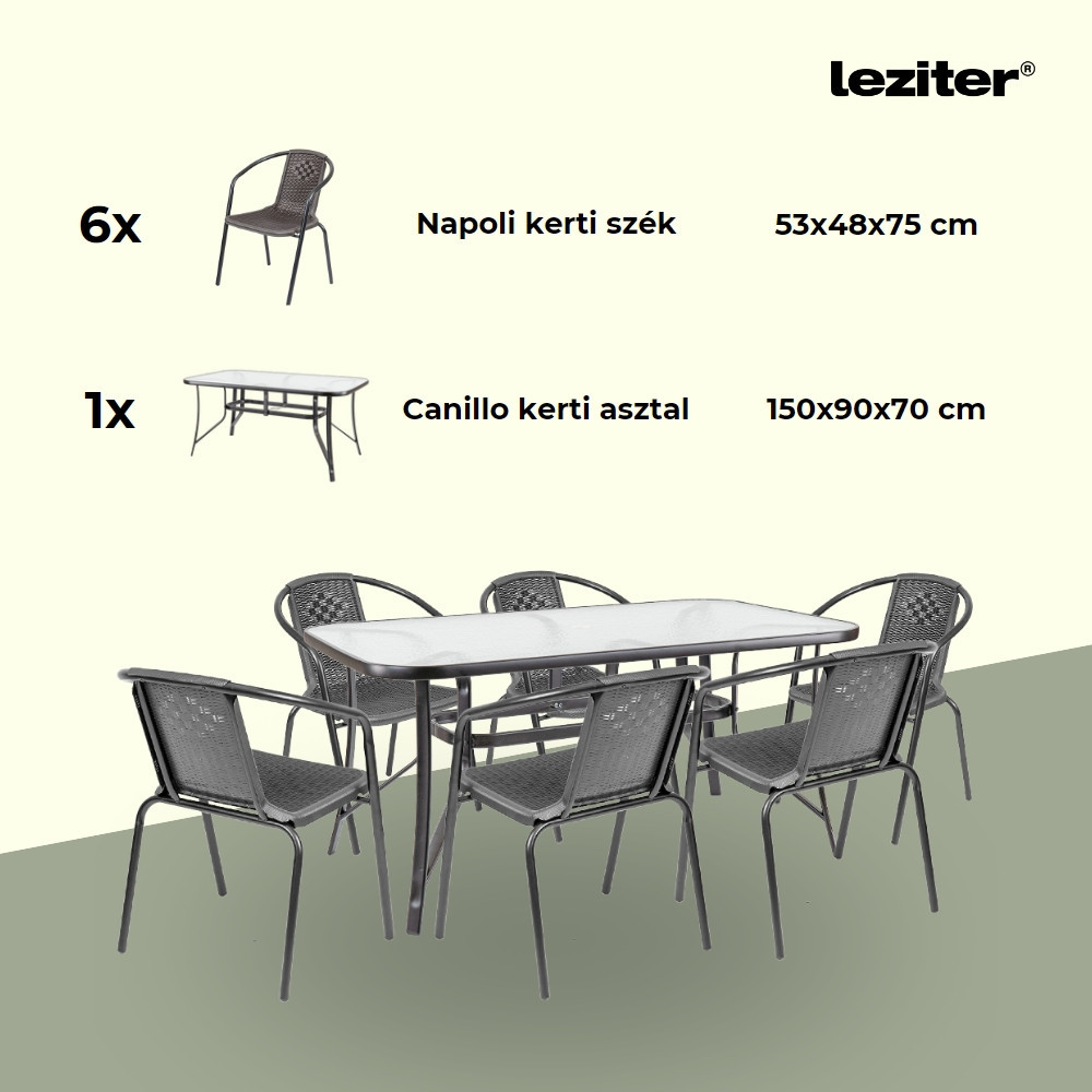 A modern kivitelű kerti bútorkészlet egy kerti üveglapos asztalt és 6 széket tartalmaz. A bútorokat 6 fő számára tervezték. A székek és az asztal lábazata fémből készül. Az asztallap 5 mm-es edzett üvegből készült, amely ellenáll a kisebb karcolásoknak. A műanyag szék ülésanyaga ellenáll az időjárási viszonyoknak. Előnye az ergonómikusan profilált ülés és karfa, amelyek tehermentesítik a vállakat pihenés közben.