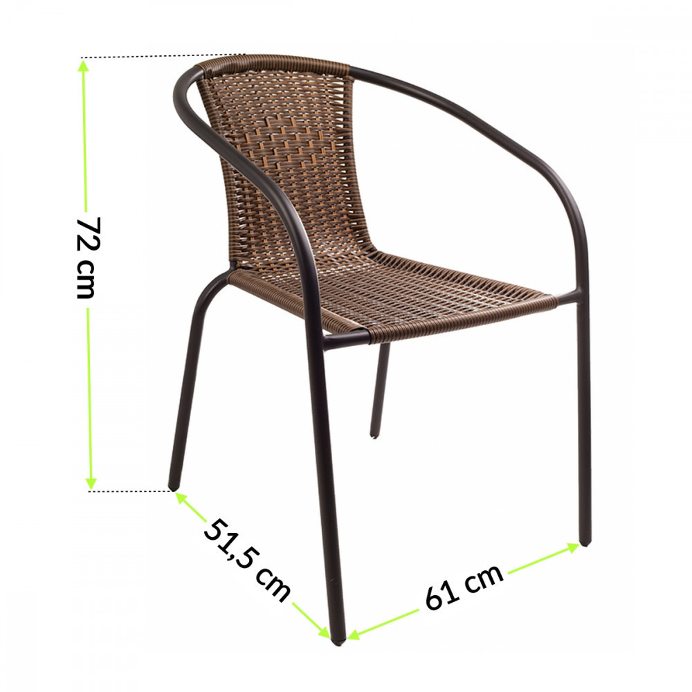 A szék szerkezete acélból készül. Az ergonomikus szék ülése polirattan fonatból készül, amely biztosítja a levegő keringését a hát és a háttámla között. A kiválasztott anyagoknak köszönhetően a kerti szék ellenáll az időjárási viszonyoknak. A kis méretű könnyű szék könnyen mozgatható. A kerti szék előnye a kartámasz, amely jelentősen növeli az ülés kényelmét. A felhasznált anyagok kombinációja a szék modern kialakítását hozza létre, amelynek köszönhetően esztétikusan illeszkedik bármilyen környezetbe. A rattan szék meglehetősen népszerű a kertben , a teraszon vagy az erkélyen , valamint éttermekben vagy kávézókban.