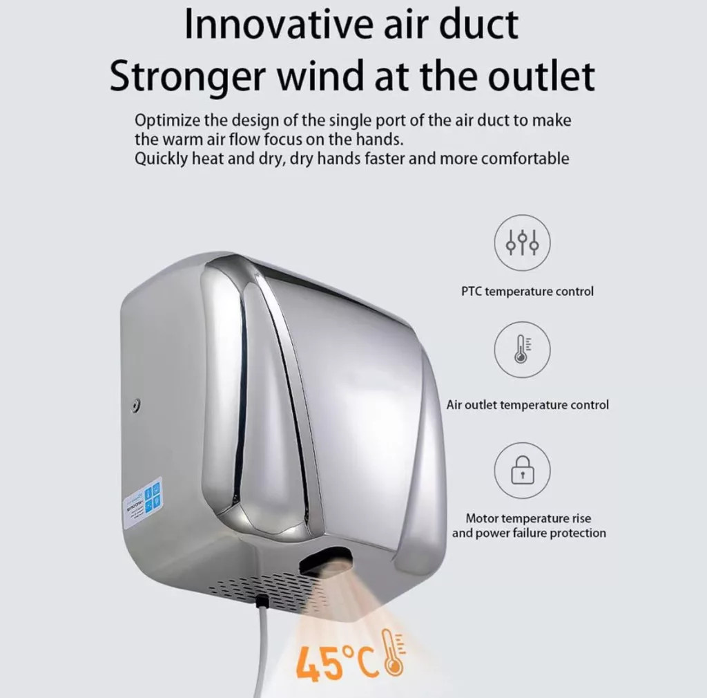Ez a króm színű, 1800 W teljesítményű elektromos kézszárító infravörös érzékelővel működik, amely automatikusan elindítja a szárítást kézérintés nélkül. Hatékony és higiénikus megoldás közösségi és otthoni mosdókba egyaránt.