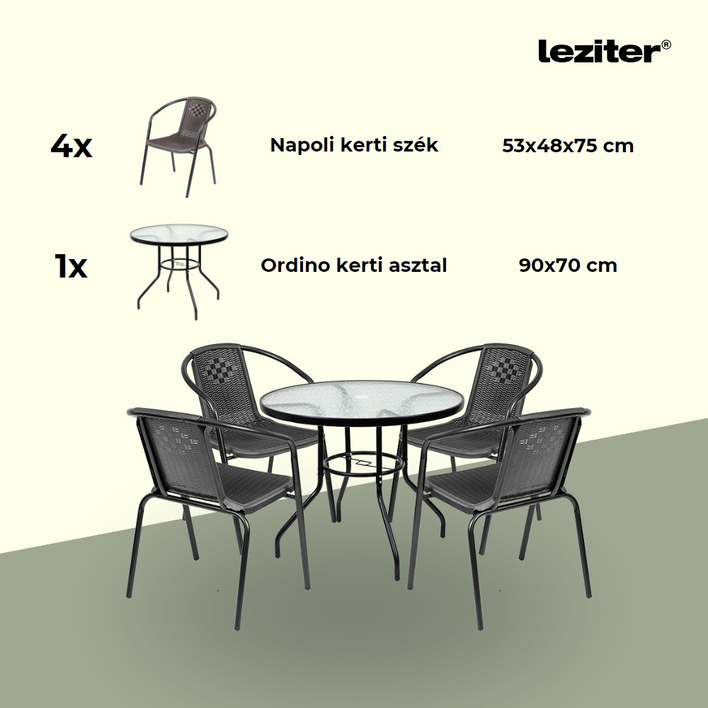 A modern kivitelű kerti bútorkészlet egy kerti üveglapos asztalt és 4 széket tartalmaz. A bútorokat 4 fő számára tervezték. A székek és az asztal lábazata acélból készül. Az asztallap 5 mm-es edzett üvegből készült, amely ellenáll a kisebb karcolásoknak. A műanyag szék ülésanyaga ellenáll az időjárási viszonyoknak. Előnye az ergonómikusan profilált ülés és karfa, amelyek tehermentesítik a vállakat pihenés közben.