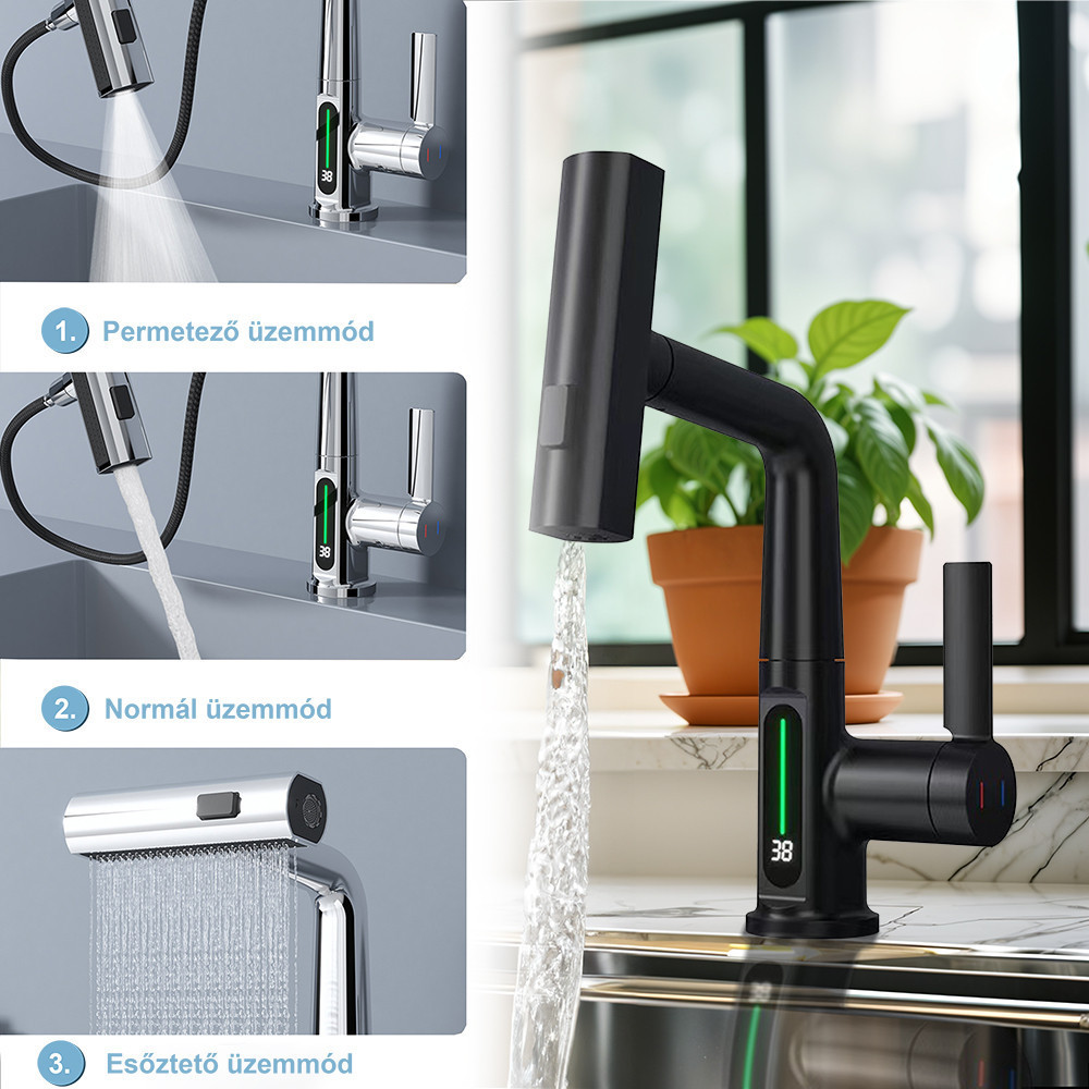 Van digitális hőmérséklet kijelző a csaptelepen? Igen, a csaptelep beépített digitális hőmérséklet kijelzővel rendelkezik, amely pontosan mutatja a víz hőmérsékletét különböző színekkel jelezve: kék (0-30°C), zöld (30-40°C) és piros (40-49°C).