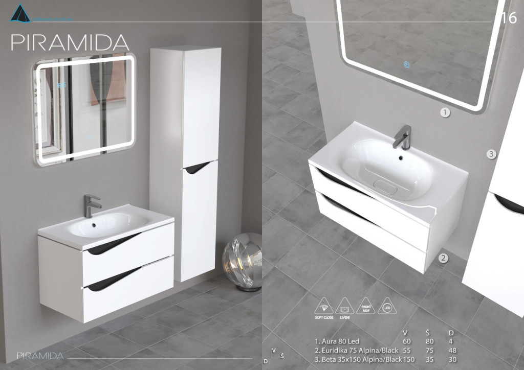 A Piramida BETA fürdőszobai állószekrény a tároló funkció és a modern megjelenés tökéletes ötvözete. A matt fekete szín merész és modern hatást kelt, amely egyre népszerűbb a kortárs fürdőszoba berendezésekben. A fehér-fekete kétszínű felületű szekrény állítható polcokkal és zárt tárolórekeszekkel érkezik, és összeszereléve szállítjuk – falra akasztással vagy felállítással azonnal üzembe helyezhető.