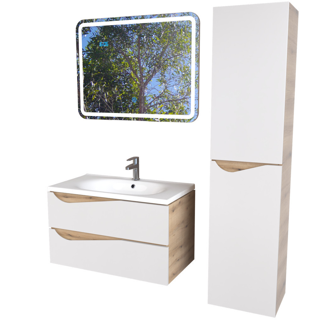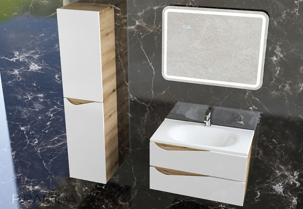 A Piramida EURIDIKA fali fürdőszobabútor öntött műmárvány mosdókagylóval érkezik – teljes megoldás egyetlen csomagban, amellyel azonnal rendezheti fürdőszobája kiegészítőit. Az 75 cm széles, fehér-tölgy színű falra szerelhető szekrény magas minőségű MDF lapból készül, Soft Close csillapított zsanérokkal, és összeszerelt állapotban szállítjuk.