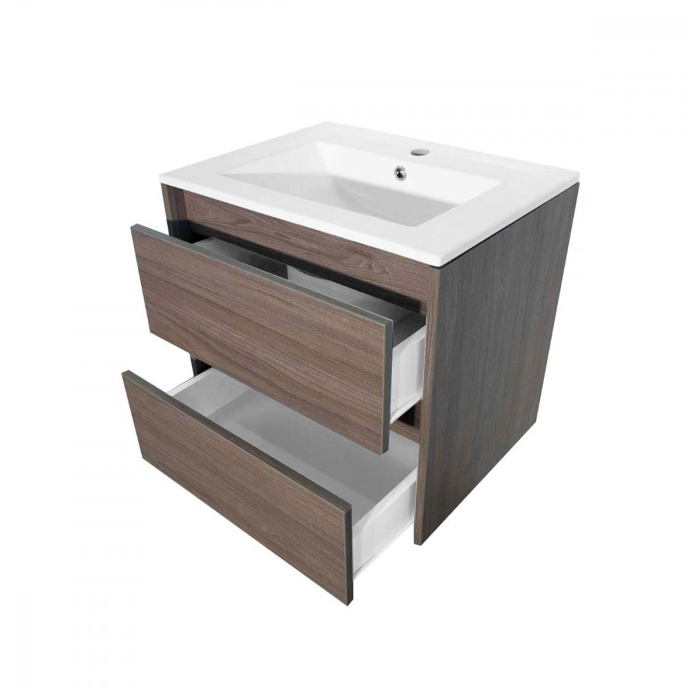 A fürdőszoba bútor kevés helyet foglal viszont rendelkezik két tágas fiókkal ahol kényelmesen elférnek a fürdőszobai pipere eszközök. Kevés helyigénye miatt kisebb fürdőszobák berendezésére is alkalmas, például panel lakásokban. A termék magas minőségű bútorlapból készül és színben passzoló élzárókkal van ellátva. A fürdőszoba bútor felfüggesztett kivitelben kapható.