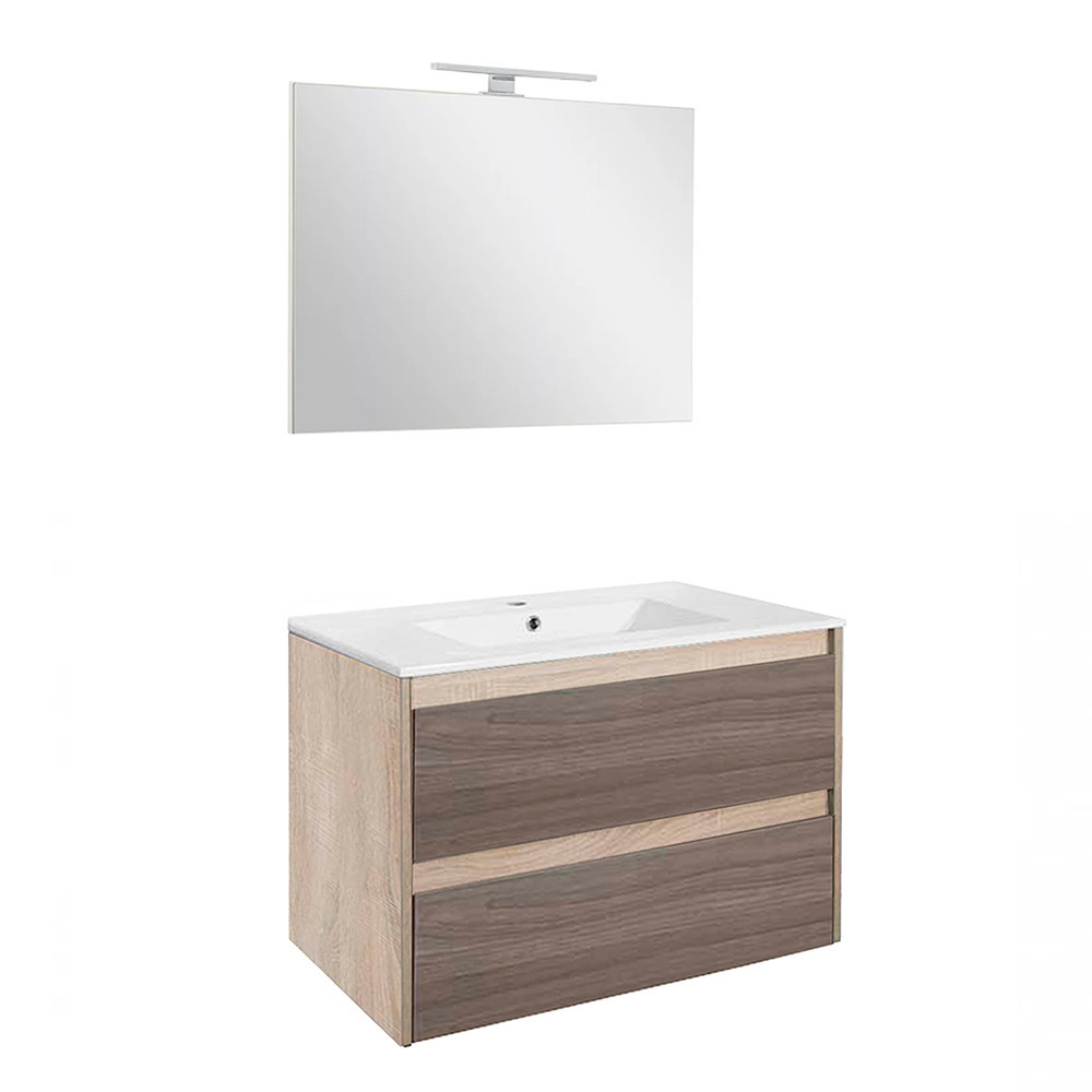 Leziter Porto Prime 80 komplett sonoma tölgy–rauna szil – alsó szekrény mosdóval és CUBE tükörrel