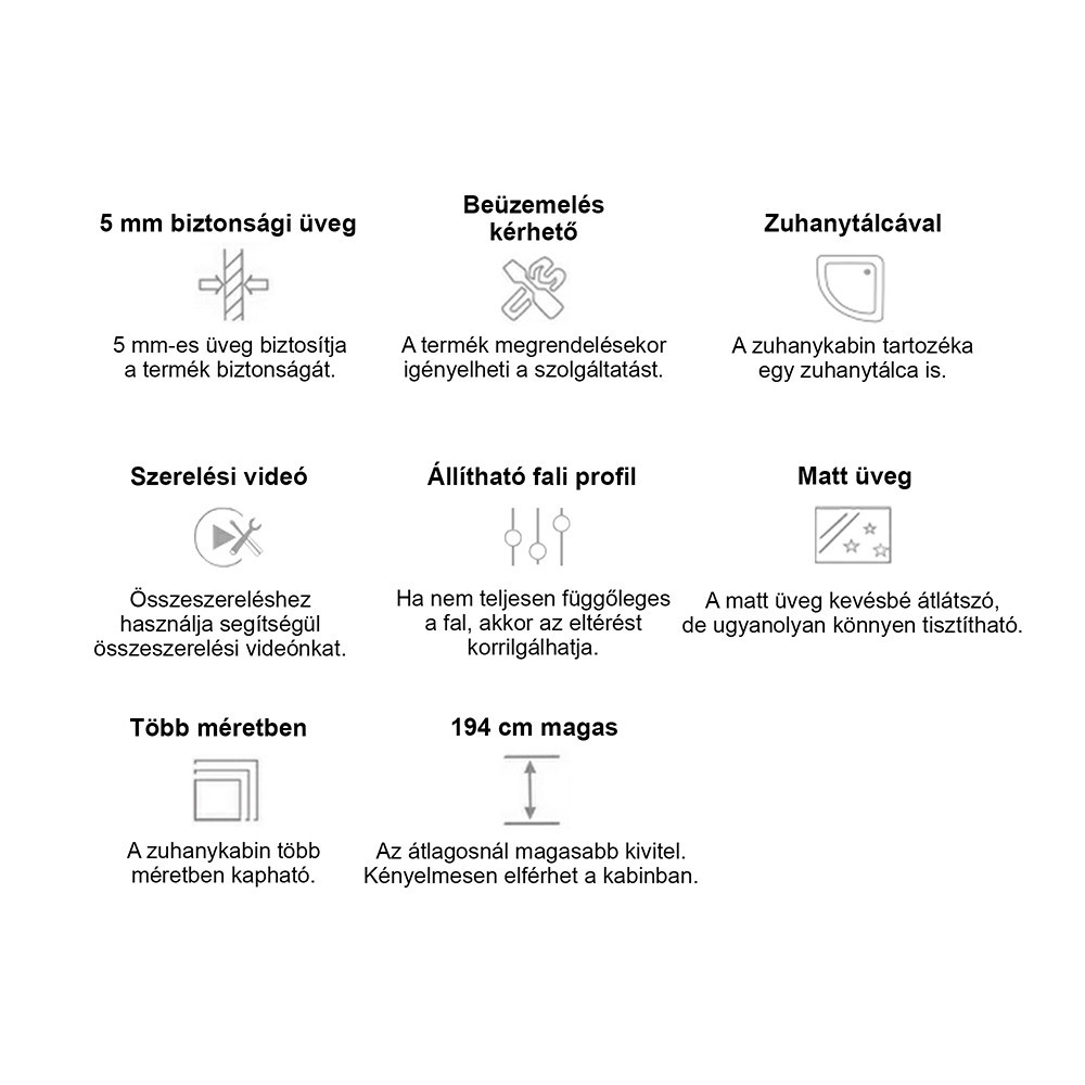 - Magasság: 180 cm (kabin), 194 cm zuhanytálcával együtt