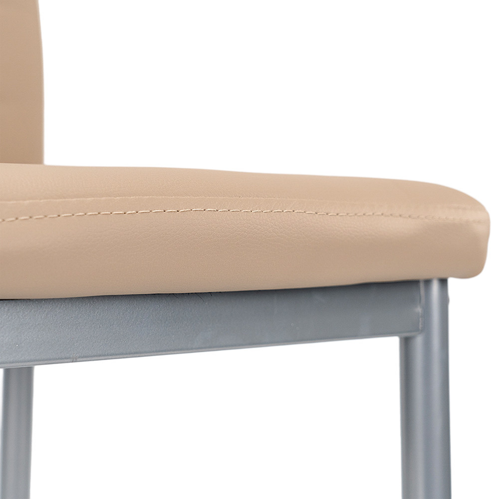 Az ülőfelület és a háttámla bézs színe tartós és könnyen tisztítható anyagból készült. A szürke porfestett vas lábak pedig stabil tartást biztosítanak a széknek.