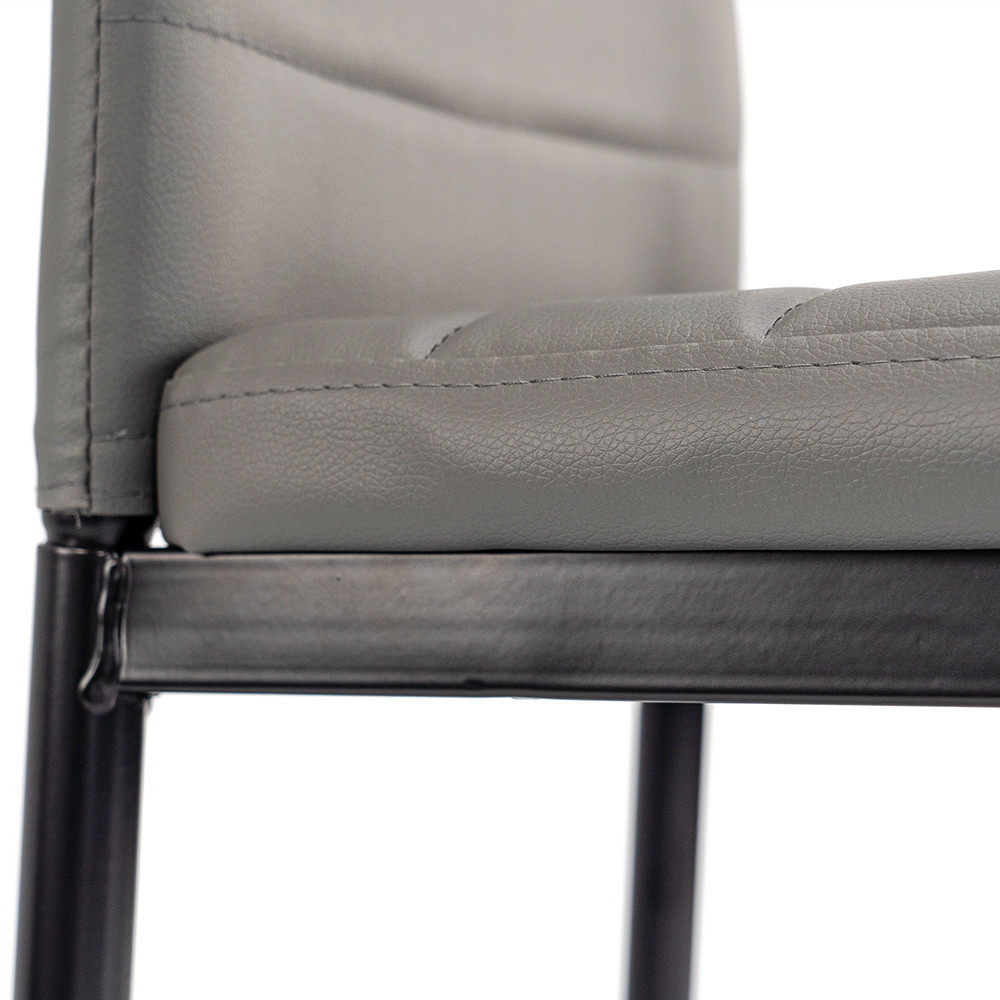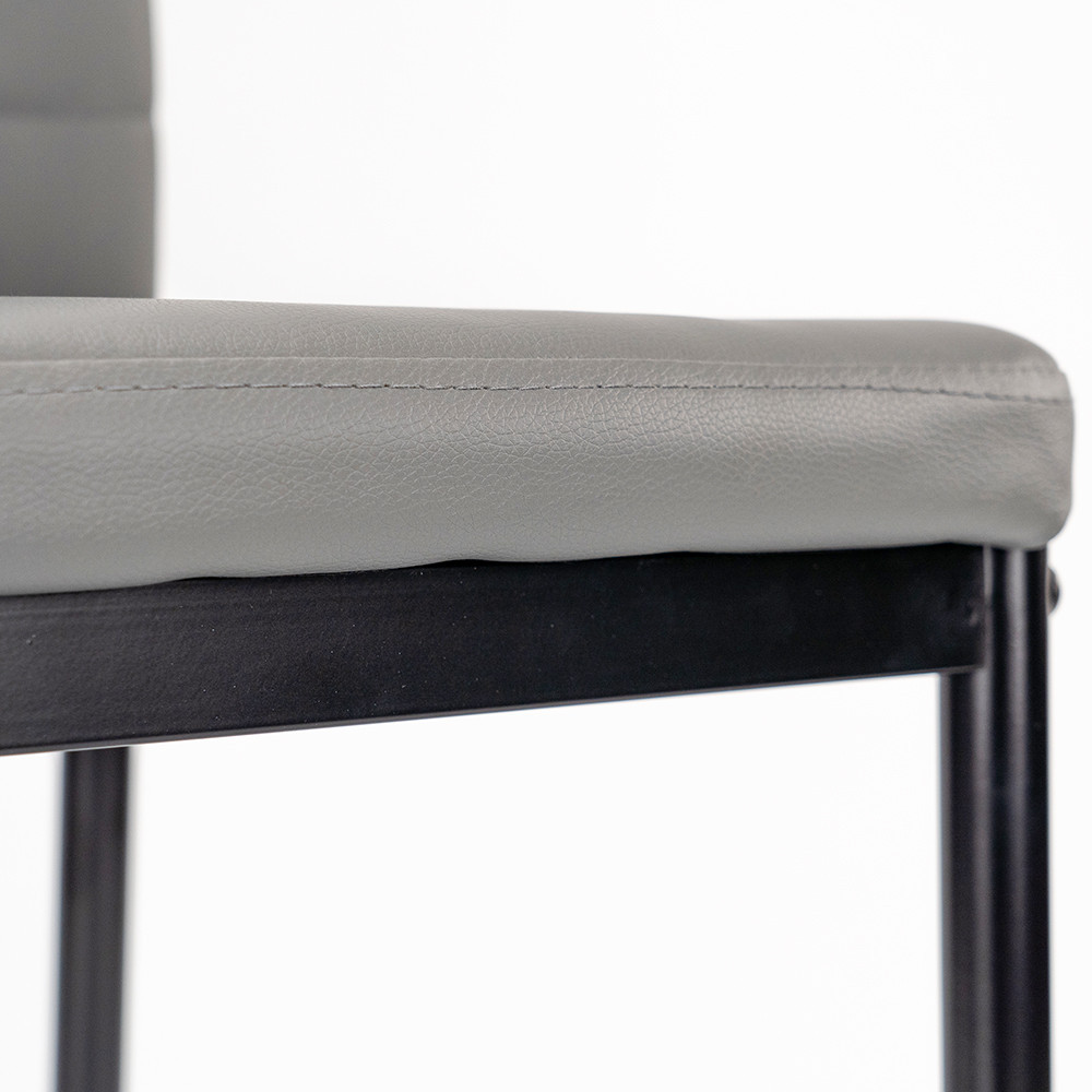 Az ülőfelület és a háttámla szürke színe tartós és könnyen tisztítható anyagból készült. A fekete porfestett vaslábak pedig stabil tartást biztosítanak a széknek.