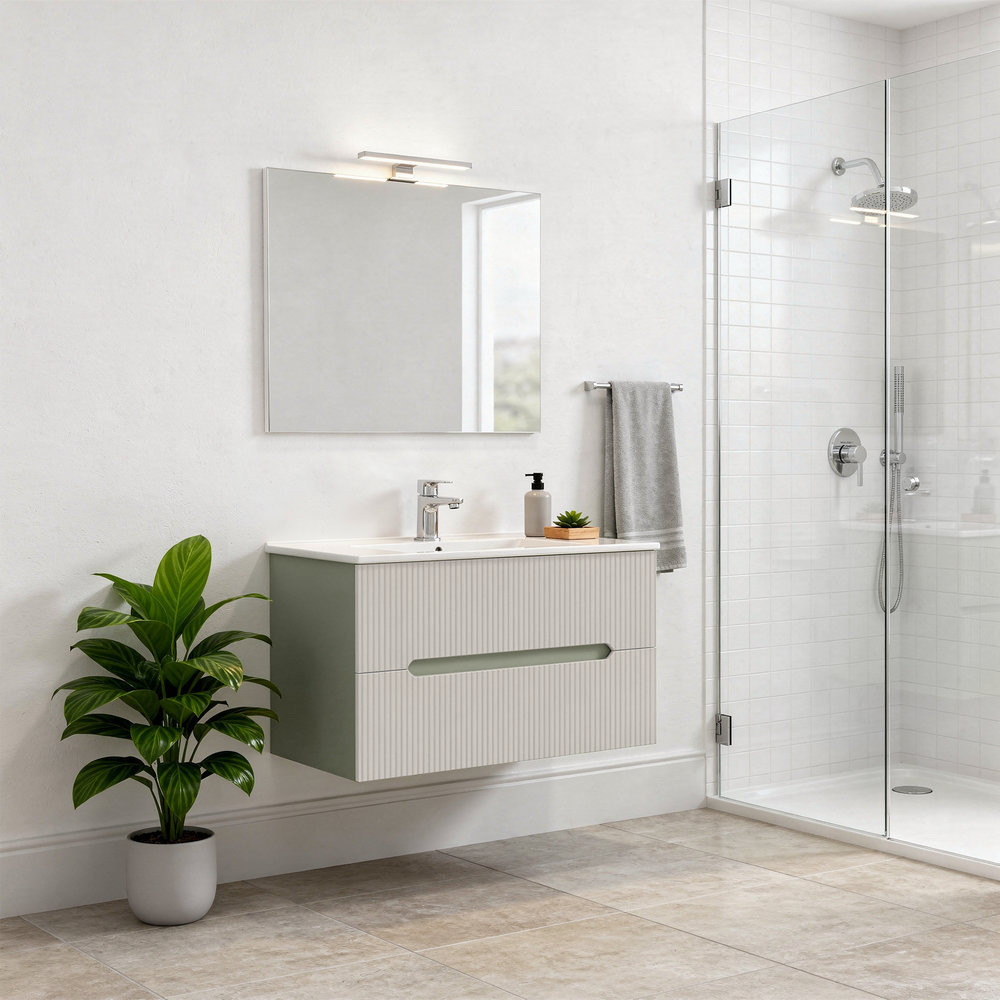A Leziter Trent fürdőszobabútor harmonikusan ötvözi a látványt és a praktikumot. A bordázott előlap letisztult, modern karaktert ad, miközben az integrált fogantyú kényelmes használatot tesz lehetővé. A fali rögzítés könnyed megjelenést teremt, a padló takarítása pedig gyorsabbá válik. A kerámia mosdó tartós, időtálló, ellenáll a mindennapos igénybevételnek és egyszerűen tisztán tartható.