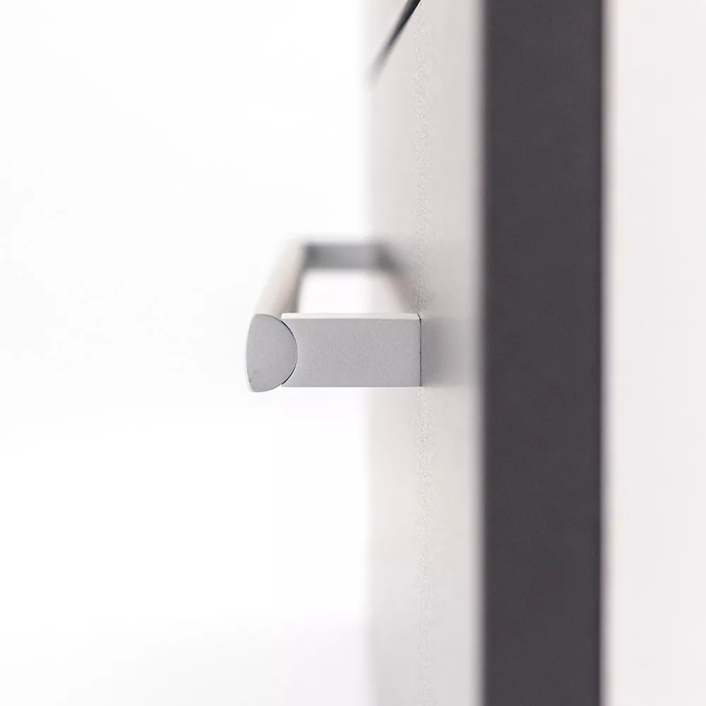 Az fehér korpusz és a antracit front kombinációja elegáns és időtálló megjelenést kölcsönöz a bútornak.