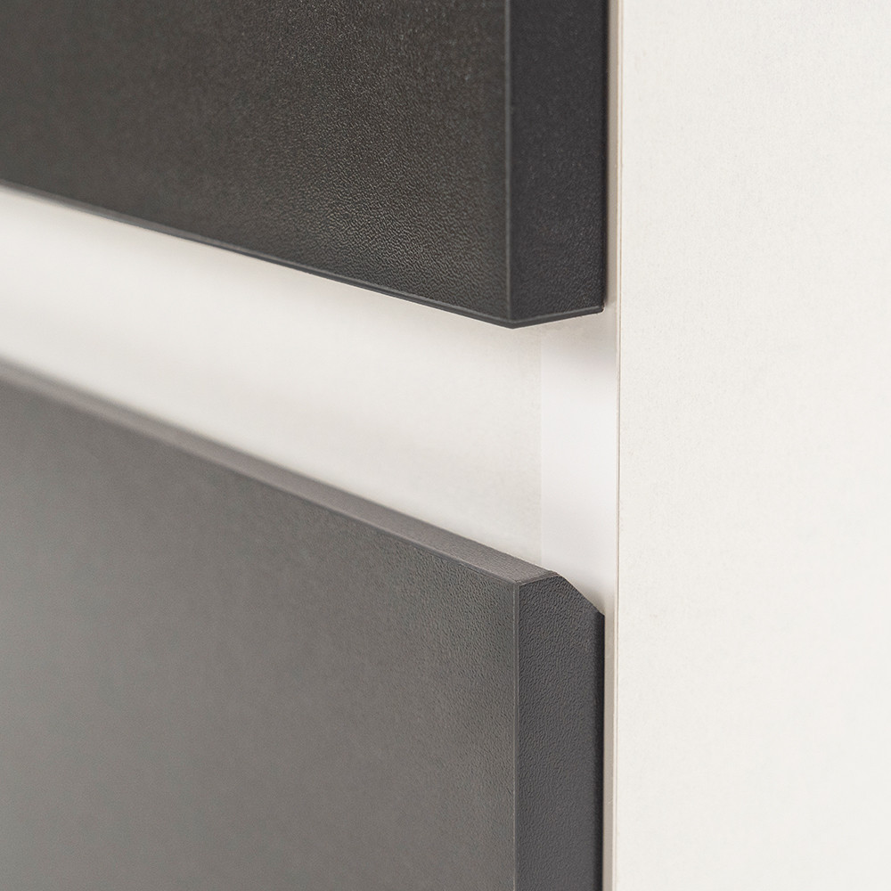 Az fehér színű korpusz és a antracit front kombinációja elegáns és időtálló megjelenést kölcsönöz a bútornak.