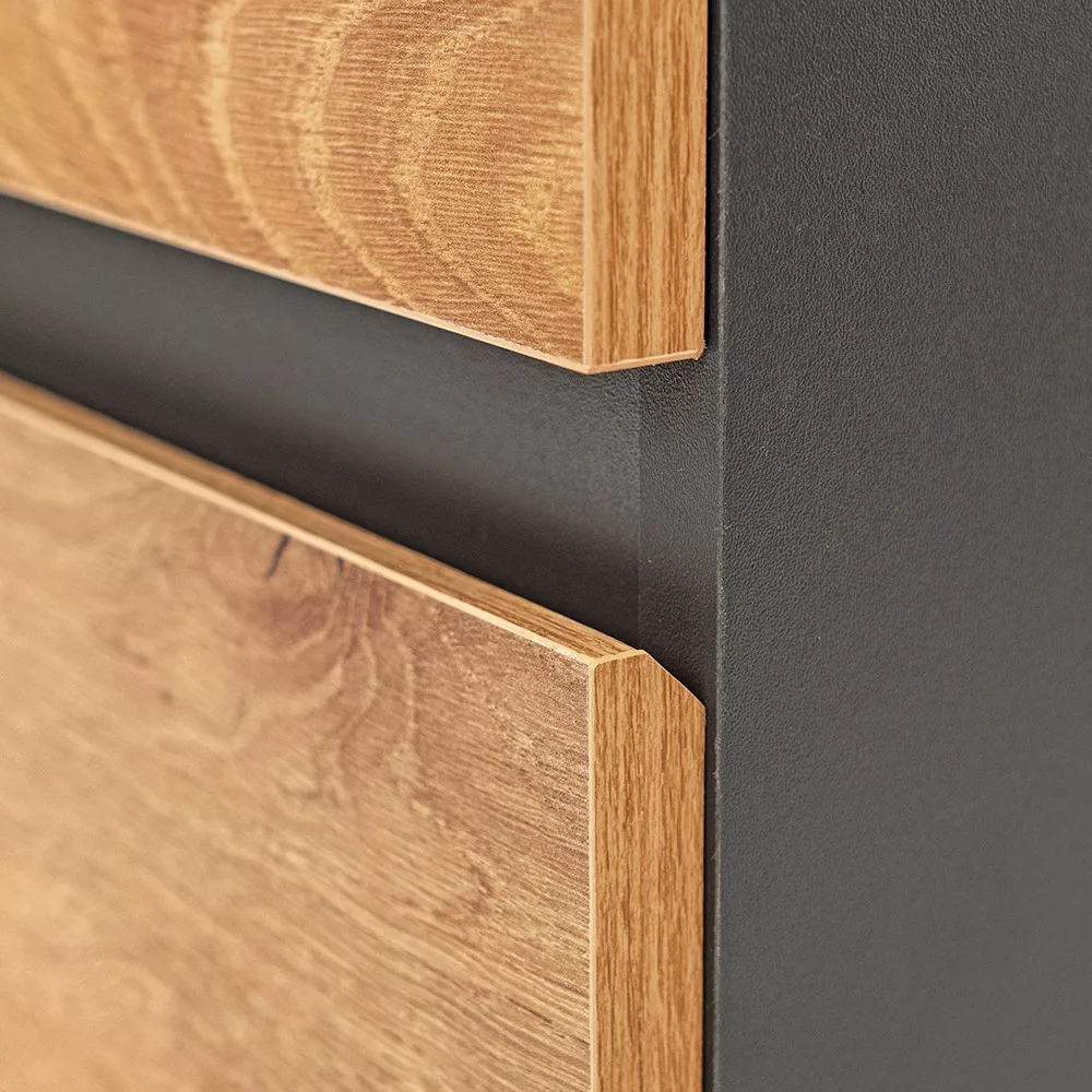 Az antracit korpusz és a tölgy front kombinációja elegáns és időtálló megjelenést kölcsönöz a bútornak.
