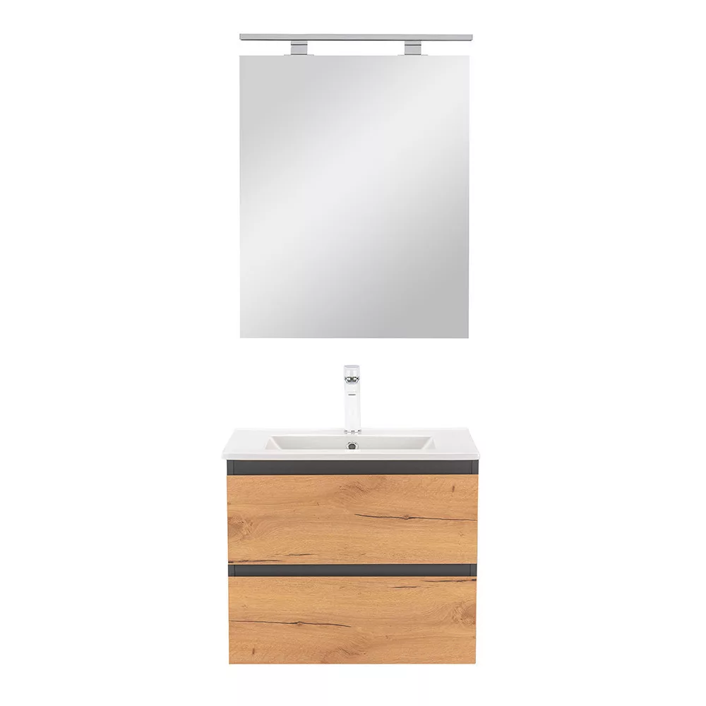 A Vario Forte60 komplett fürdőszobabútor egy stílusos és praktikus választás modern fürdőszobához. Kompakt méretei ideálisak kisebb és közepes méretű fürdőszobákba is, a 45 fokos élzáródás modern hatást, a antracit-tölgy színű dizájn elegáns megjelenést kölcsönöz a térnek. A csillapítós fiókzáródás és a felfüggesztett kivitel a kényelmet és könnyű tisztántartást szolgálja, míg a minőségi anyagok hosszú élettartamot biztosítanak.