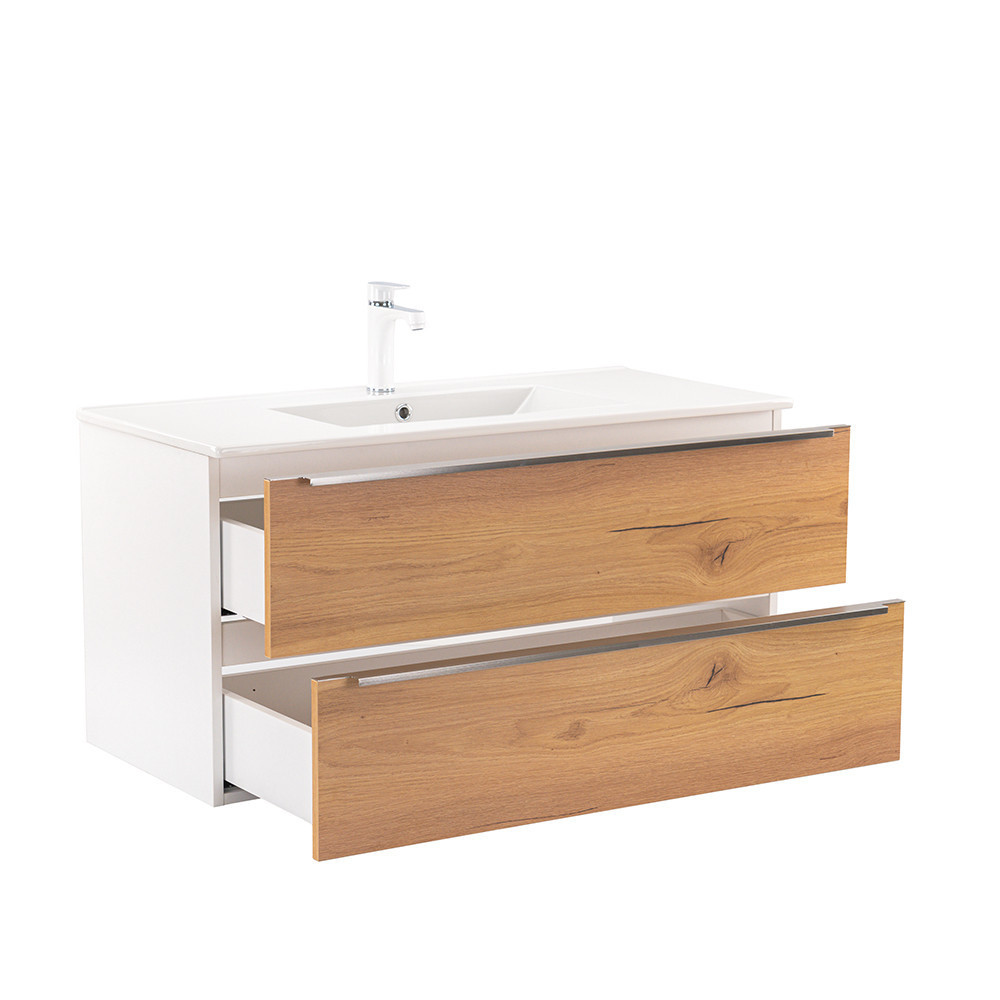 - Elegáns és praktikus mosdó: A bútor flat design kerámia mosdóval érkezik, amely egy medencés kivitelű. Modern, esztétikus és könnyen tisztítható.