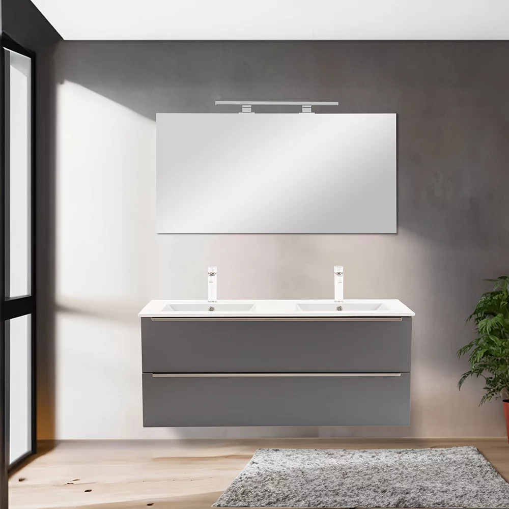 - Elegáns és praktikus mosdó: A bútor flat design kerámia mosdóval érkezik, amely kétmedencés kivitelű. Modern, esztétikus és könnyen tisztítható.
