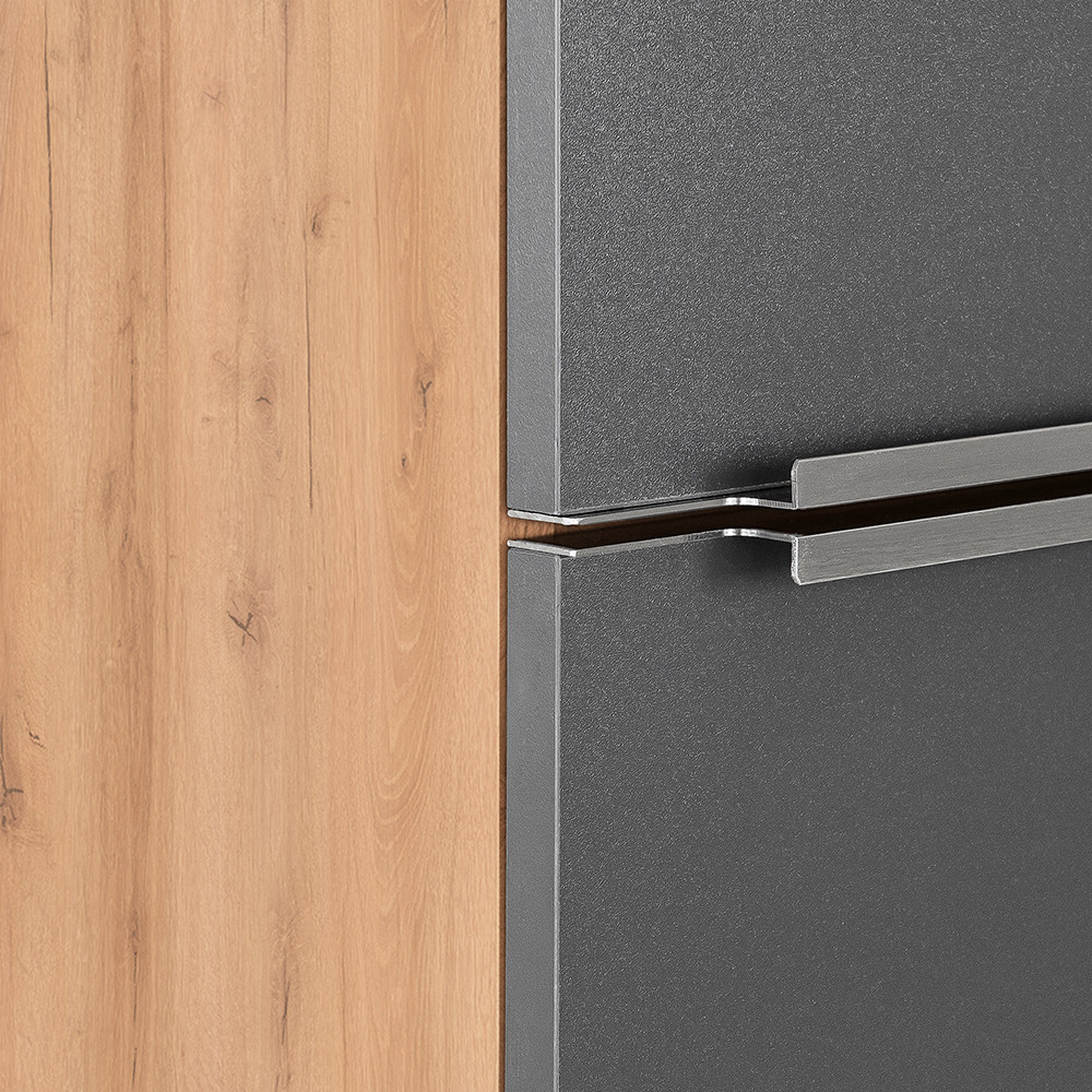 A felfüggesztett kivitelű Vario Trim 35 függesztett oldal szekrény modern, letisztult megjelenést ad a fürdőszobának, miközben megkönnyíti a mindennapi takarítást: a padló szabadon marad alatta, így a tér tágasabbnak, rendezettebbnek hat. A bútor ajtaja balra és jobbra egyaránt felszerelhető, ami különösen előnyös kisebb alapterületű fürdőszobákban, ahol minden centiméter számít. A szekrény tartós bútorlapból készül, amely ellenáll a mindennapos fürdőszobai páratartalomnak. A felületek könnyen tisztíthatók. A Trim fém fogantyúprofil tovább erősíti a bútor elegáns, modern karakterét; kényelmes használatot biztosít, és harmonikusan illeszkedik az tölgy-antracit felületek kifinomult megjelenéséhez.