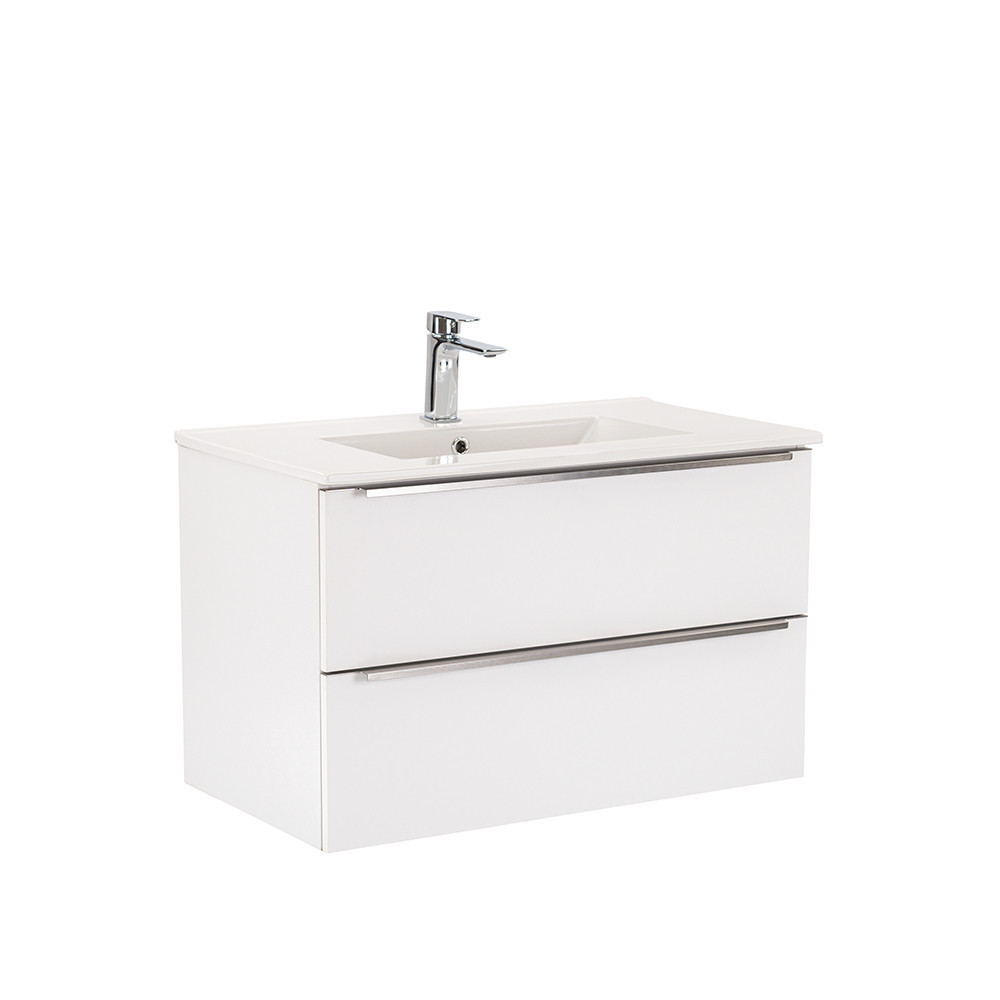 A Vario Trim 80 komplett fürdőszobabútor egy stílusos és praktikus választás modern fürdőszobához. Kompakt méretei ideálisak kisebb és közepes méretű fürdőszobákba is, és a fém fogantyú profil patinás hatást, az fehér-fehér színű dizájn elegáns megjelenést kölcsönöz a térnek. A csillapítós fiókzáródás és a felfüggesztett kivitel a kényelmet és könnyű tisztántartást szolgálja, míg a minőségi anyagok hosszú élettartamot biztosítanak.