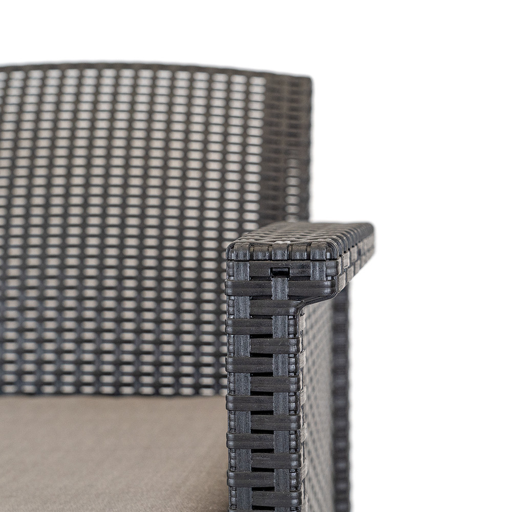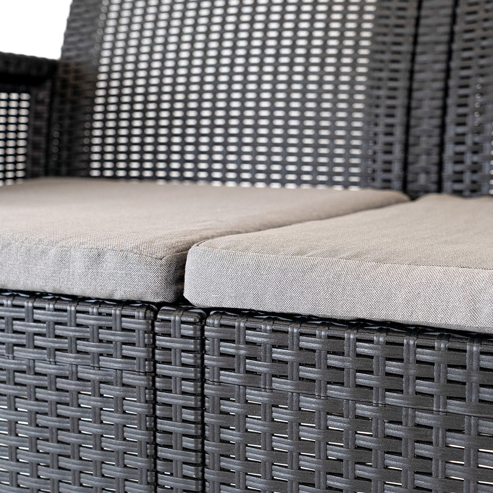 A Venus 2 üléses kerti kanapé visszafogott grafit színben készül. Az ülő párnák néhány árnyalattal világosabbak, ami egyedülálló hatást és elenganciát kölcsönöz.