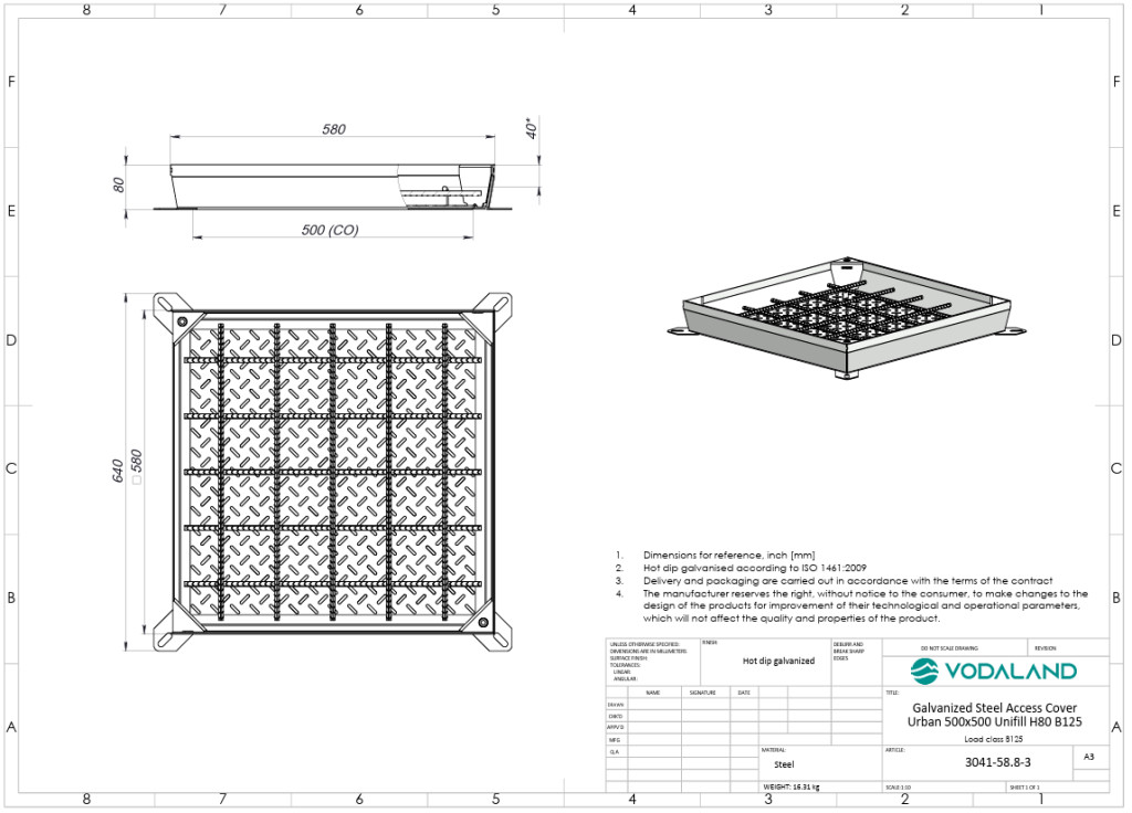 fedlap OZ URBAN UNIFILL rejtett négyzetes 580x580 PL.500x500 Hext.80 Hin.40 zárral B125 (3041-58.8-3)