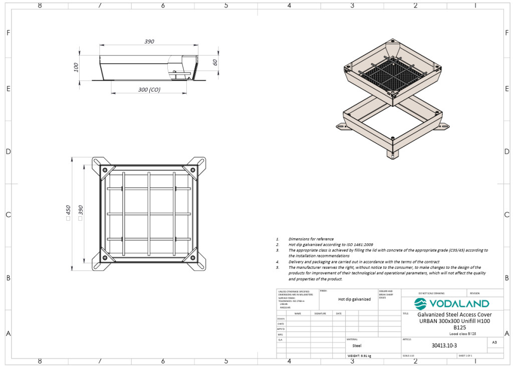 fedlap OZ URBAN UNIFILL rejtett négyzetes 390x390 PL.300x300 Hext.100 Hin.60 zárral B125 (30413.10-3)