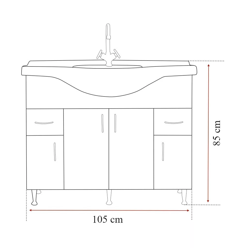 A fürdőszobabútor kevés helyet foglal viszont tágas alsó szekrénnyel és tükörrel (világítás nem tartozéka a terméknek) rendelkezik ahol kényelmesen elférnek a fürdőszobai pipere eszközök. Kevés helyigénye miatt kisebb fürdőszobák berendezésére is alkalmas, például panel lakásokban. A termék magas minőségű bútorlapból készül és színben passzoló élzárókkal van ellátva. A fürdőszoba bútor mosdóval együtt kapható.