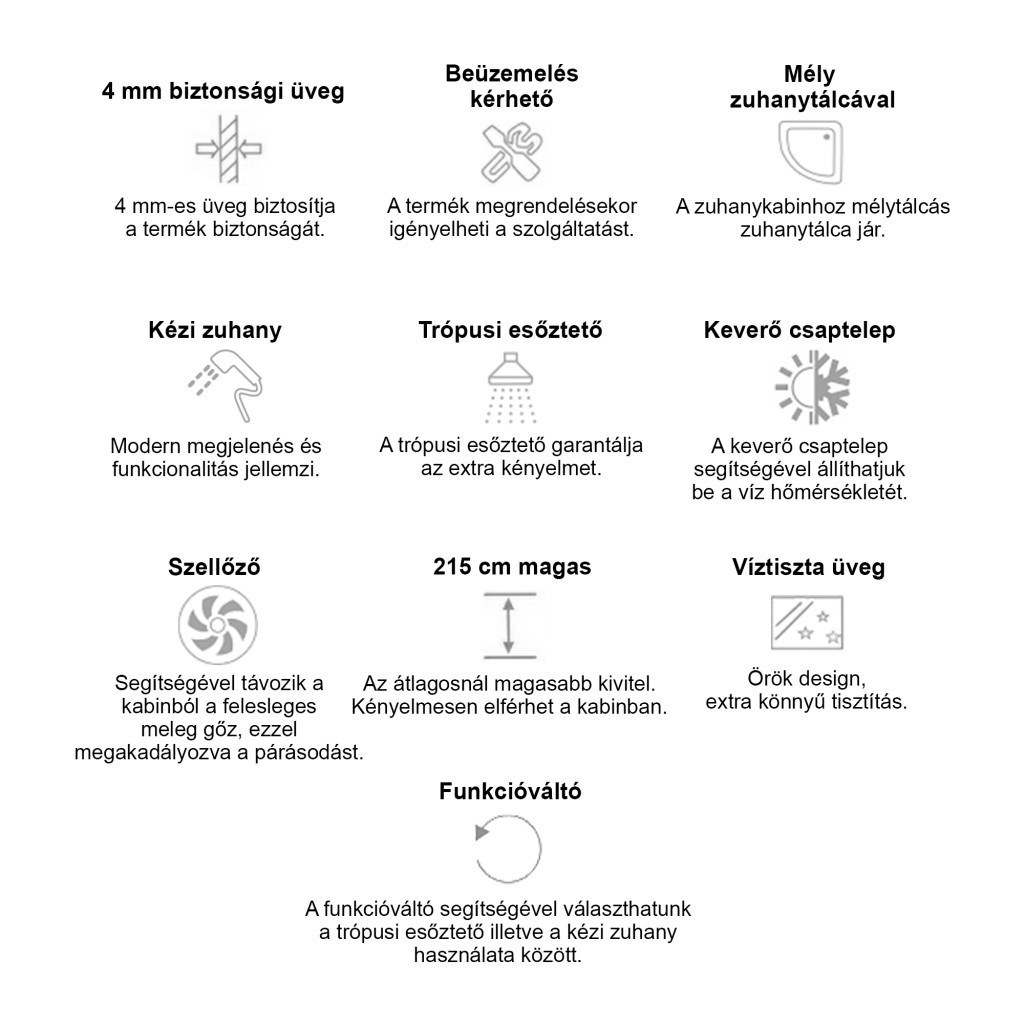 A Cora zuhanykabin számos hasznos funkcióval rendelkezik. Pipere polccal van felszerelve, melynek köszönhetően rendben tudod tartani a tisztálkodáshoz szükséges eszközeit. Trópusi esőztetővel és kézi zuhannyal is rendelkezik, melyet a funkcióváltóval lehet váltakoztatni. A víz hőmérsékletét a keverő csapteleppel lehet beállítani. A trópusi esőztető mellett helyezkedik el kettő szellőző, melyeknek köszönhetően távozik a felesleges meleg gőz ezzel megakadályozva a kabin párásodását.