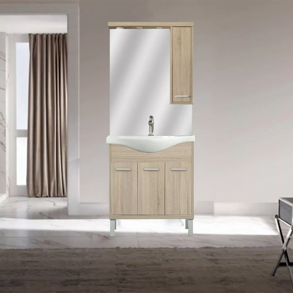 A fürdőszobabútor kevés helyet foglal viszont tágas alsó és felső szekrénnyel rendelkezik, ahol kényelmesen elférnek a fürdőszobai pipere eszközök. Kevés helyigénye miatt kisebb fürdőszobák berendezésére is alkalmas, például panel lakásokban. A termék magas minőségű bútorlapból készül és színben passzoló élzárókkal van ellátva. A fürdőszobabútor mosdóval együtt kapható.