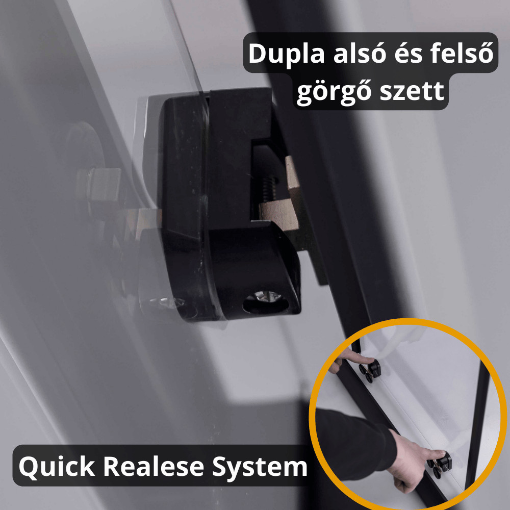 - egy tolóajtós rendszer dupla görgőkkel: Az alsó és felső görgők garantálják az ajtók könnyed és halk működését.