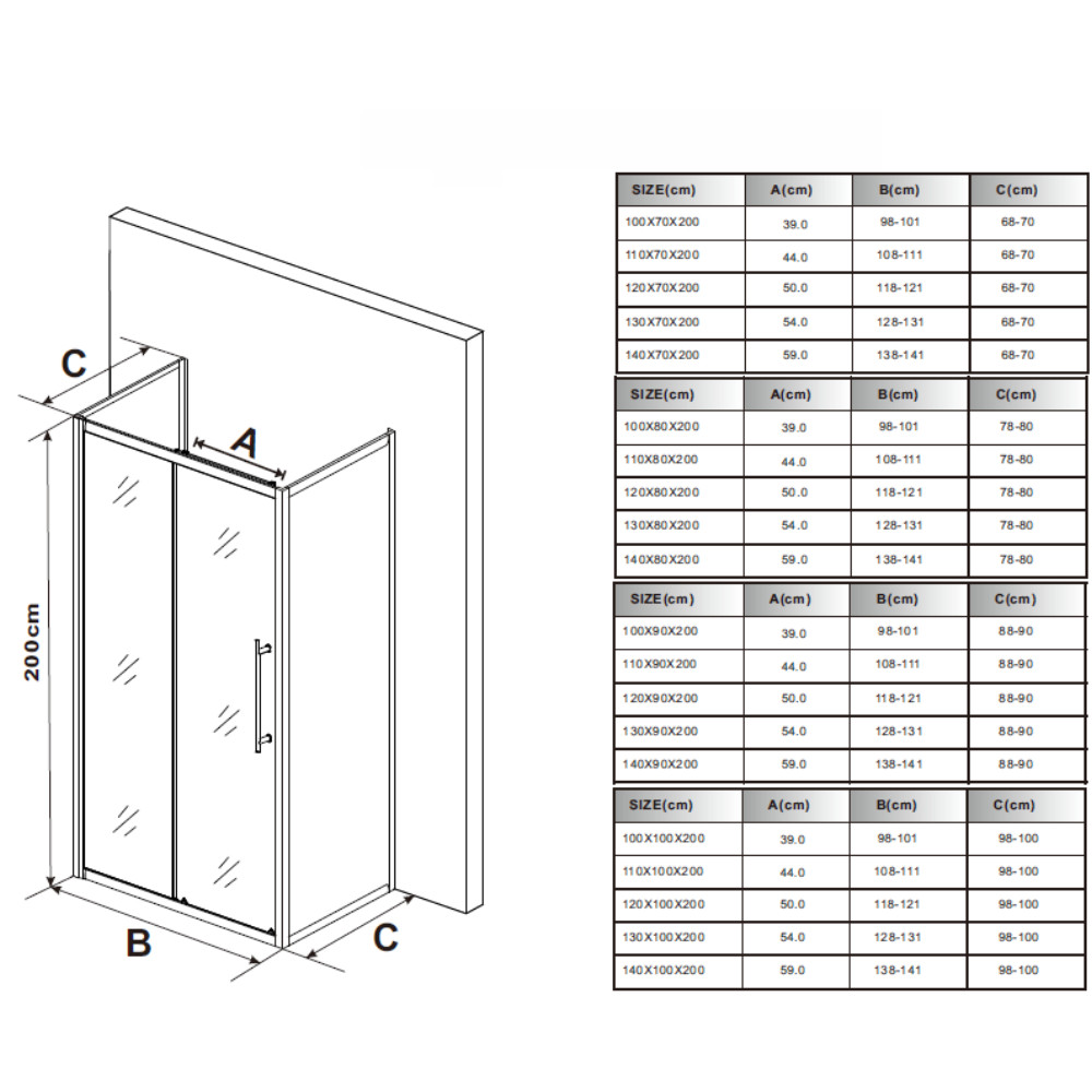 A zuhanykabin beépítési mérete a pareméterek között található Beépítési méret paraméter alatt.