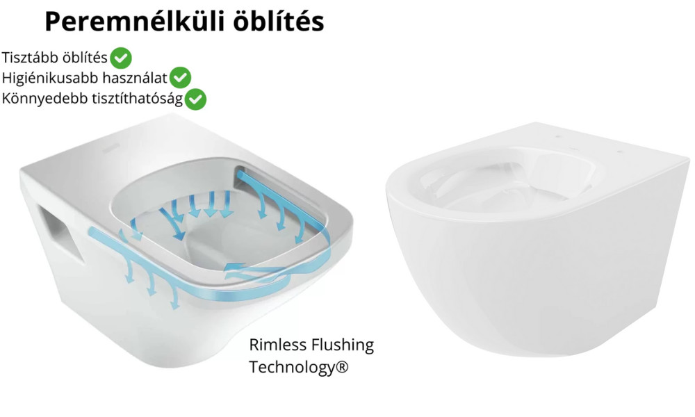 A perem nélküli technológia lehetővé teszi a víz pontos elosztását a WC-csésze belsejében az öblítés során, továbbá megakadályozza a baktériumok letelepedését a hagyományos kialakítással szemben.
