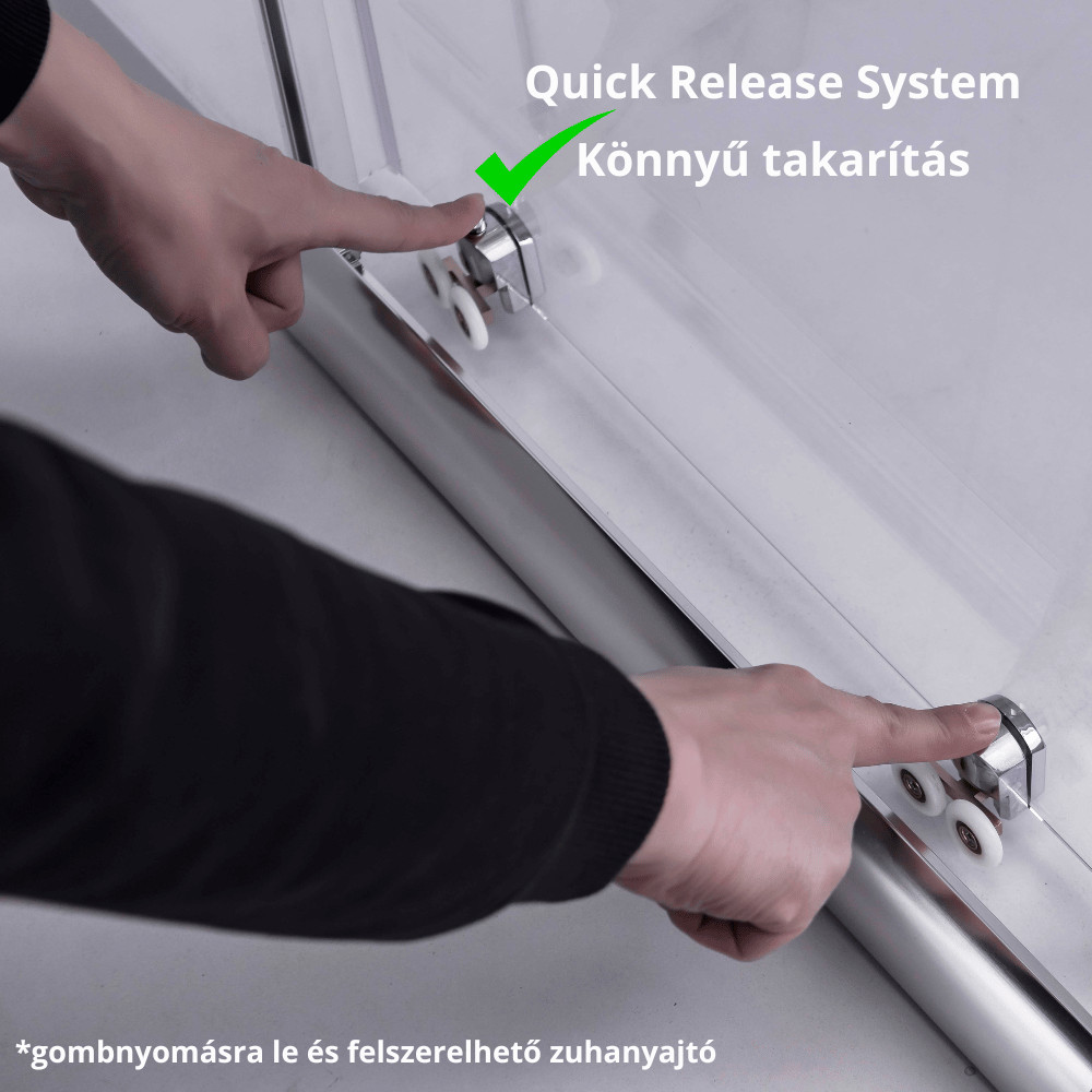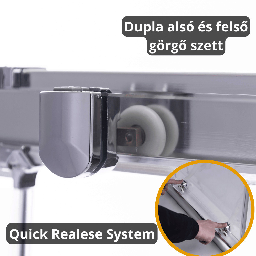 A zuhanyajtó dupla görgőkkel kaphatóak, amiknek előnye, hogy jobban eloszlik rajtuk a terhelés, mivel egy ajtó 2 pont helyett 4 ponton gördül. Ez biztosítja az egyenletesebb, simább működést és a hosszabb élettartamot. A görgők további fontos tulajdonságai, hogy Quick Release Systemmel (QRS) ellátottak, aminek segítségével könnyedén fel- és leszerelhetőek a zuhanyajtó ajtaja a könnyedebb tisztítás érdekében.