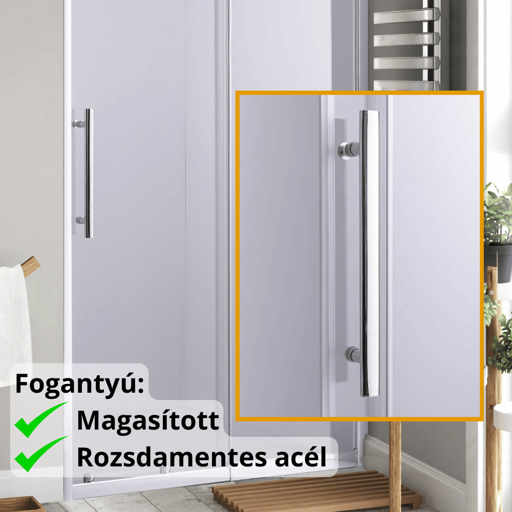 - Króm színű magasított rozsdamentes acél fogantyúk: Elegáns megjelenést kölcsönöznek a zuhanyajtónak.