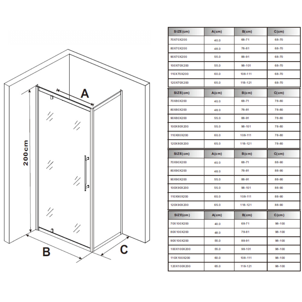 A zuhanykabin beépítési mérete a pareméterek között található Beépítési méret paraméter alatt.