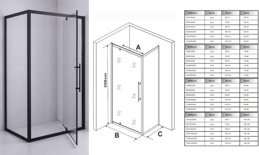 - Nyílóajtós zuhanyajtó helytakarékos elhelyezéssel: A termék zsanérja bentebb helyezkedik el így a nyílási mérete csökken, hiszen a zuhanyajtó nem teljes szélességében nyílik ki.