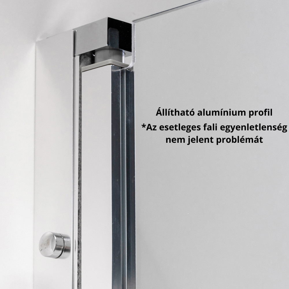 - Prémium profilok: Polírozott króm alumínium, állítható fali csatlakozással.